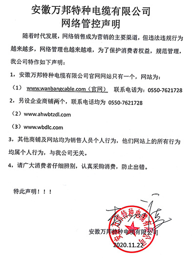 鄭重聲明:安徽萬邦特種電纜有限公司官方網站為:www_wanbangcable_com.jiboled.cn,除此之外無任何子網站或合作網站,其余均為假冒偽劣。電話:0550-7621728 13485756353 地 址:安徽省天長市滁州高新技術產業開發區經四路29號